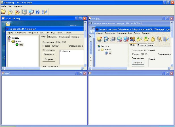 В данном окне интерфейса программы могут быть сгруппированы несколько (в общем случае – любое количество, все зависит от монитора сервера безопасности) изображений экранных копий с различных удаленных компьютеров, которые будут обновляться в реальном времени при появлении нового снимка. Открытые окна могут быть различным способом сгруппированы, для каждого окна можно выбирать режим просмотра: в натуральную величину, либо в масштабируемом по величине окна программы виде. Это же окно используется и в том случае (для тех контролируемых компьютеров), когда экранные копии не отображаются в реальном времени, а автоматически собираются на сервере, с целью их последующего просмотра администратором в интерактивном режиме (по его запросу). При выборе пункта «Открыть скриншот» будет предложено выбрать изображение для просмотра (данные изображения сохраняются в различных каталогах для различных компьютеров, в каждом файле хранится свой скриншот, наименование файла содержит время получения скриншота на сервер). Переход между изображениями в каталоге можно осуществить кнопками «Page UP», «Page Down».