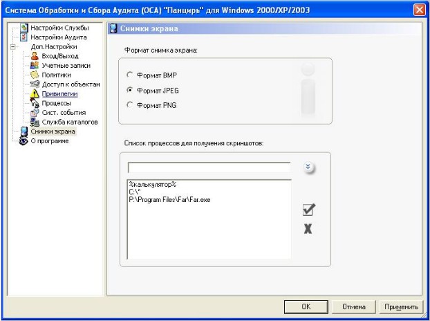 В разделе интерфейса «Снимки экрана» (см. Рис.3) для выбранного (в интерфейсе системы, см. Рис.1) компьютера, можно осуществить настройку формата снимков экрана (того формата, в котором снимки будут отправляться на сервер, что также введено для возможности снижения нагрузки на опорную сеть), а так же осуществить задание списка процессов и/или заголовков рабочих окон, при работе которых (активности окон) будет происходить съемка скриншотов (само собой, что эти и иные настройки системы могут осуществляться удаленно – с сервера безопасности). Экранная копия будет сниматься и отправляться на сервер только в том случае, если окно указанного процесса (приложения), либо непосредственно указанное в интерфейсе окно (заголовок окна), активно (пользователь непосредственно работает с окном указанного приложения).