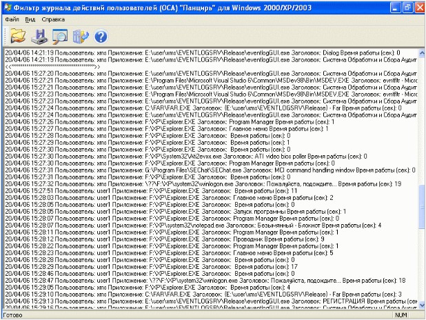 При запуске данной процедуры контроля, системой регистрируется активность окон (и смена активных окон) в процессе всего времени функционирования контролируемого вычислительного средства (пока администратором активизирована соответствующая процедура контроля). Отображение файл аудита смены активности окон представлено на Рис.5.