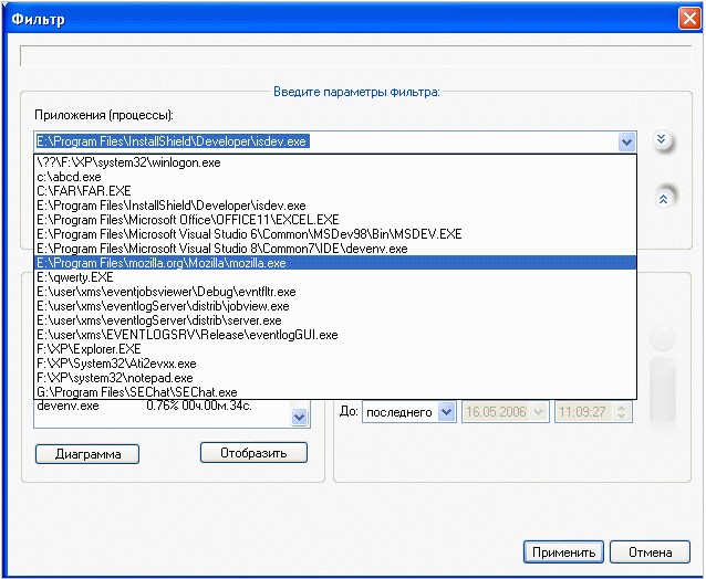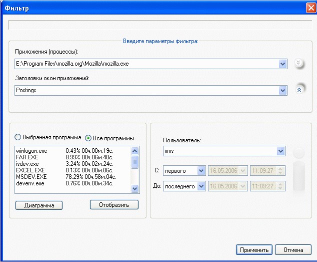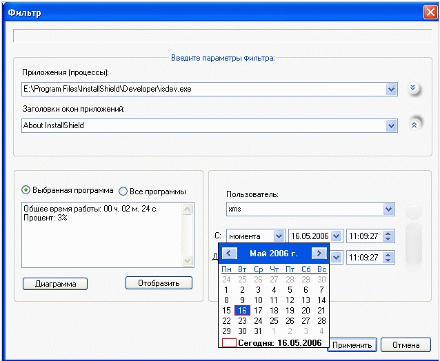 Используя возможности рассматриваемой подсистемы контроля, можно получить статистику по работе пользователя с отдельной программой за интересующий интервал времени, см. Рис.6 (все зарегистрированные системой запускаемые программы и соответствующие им заголовки окон отображаются в интерфейсе, см. Рис.7, где можно осуществить выбор контролируемой программы). При этом отобразится продолжительность работы пользователя с данной программой в течение заданного времени, и процент времени работы пользователя с данной программой, см. Рис.6.