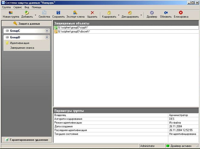 Для работы с объектами (объекты могут задаваться как полнопутевыми именами, так и масками, при этом под маску может подпадать как диск целиком, так и любые съёмные носители) необходимо создать группы, в которые включаются объекты. Для каждой группы объектов задается свой ключ кодирования (все объекты в группе будут кодироваться одним ключом), определяется «владелец» группы.