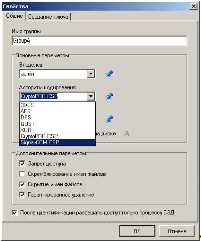 Заметим, что режим гарантированного удаления может быть установлен и для любой (в пределе для всех) группы, объекты в которых шифруются и/или к которым разграничивается доступ по ключевой информации, см. рис.3 «Дополнительные параметры».