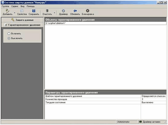 Гарантированное удаление остаточной информации. В СЗД реализовано автоматическое («прозрачное» для пользователя) гарантированное удаление данных в файловом объекте (локальном или удаленном, на жестком диске или на внешнем носителе), при его удалении или модификации штатными средствами ОС. Для защищаемых файловых объектов система позволяет задавать число «проходов очистки» и вид маскирующей информации, записываемой в файловый объект, перед удалением в нем данных штатными средствами ОС. Защищаемыми объектами являются любые (назначаемые администратором) файловые объекты – логические диски, каталоги, подкаталоги, файлы (для задания объектов может использоваться механизм масок), как на жестком диске, так и на внешних носителях, как локальные, так и удаленные (разделенные в сети).