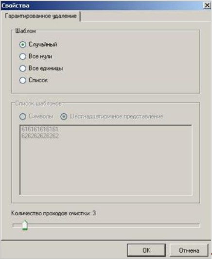 Для настройки параметров гарантированной очистки: задания шаблона (данные, которые будут записываться СЗД на место удаляемой информации), выбора количества проходов очистки (сколько раз шаблон будет записываться поверх удаляемой информации), следует воспользоваться вкладкой «Свойства», см. рис.5, при этом откроется интерфейс настройки параметров гарантированного удаления, см. рис. 7, в котором необходимо произвести настройку соответствующих параметров.