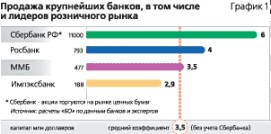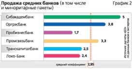 Мысль о том, что лидеры рынка, самые крупные из продававшихся банков, должны и стоить дороже прочих, на первый взгляд кажется логичной и не вызывает отторжения. Короткий перечень сделок с пакетами лидеров банковского рынка подтверждает версию «чем крупнее — тем дороже» (см. график 1). Акции Сбербанка, которые торгуются на фондовом рынке по цене, близкой к 6 капиталам, укладываются в эту тенденцию.