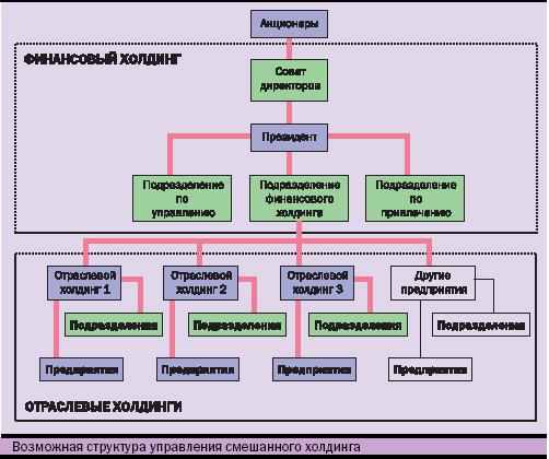 Наконец, подразделения по управлению активами и контролю за бизнесом. Их роль в корпоративном управлении смешанным холдингом прежде всего состоит в оказании отраслевым холдингам услуг по разработке стратегии и принятию инвестиционных решений, по повышению эффективности деятельности, приводящих к повышению капитализации отраслевых холдингов (организации закупок, внедрению инвестиционного процесса и т.п.), помощи в вопросах слияний и поглощений, оказании услуг акционерам по финансовому контролю и аудиту деятельности отраслевых холдингов.