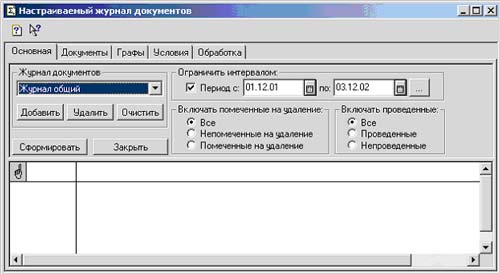 Перед нами окно с 5-ю закладками. Перемещаясь по ним, можно очень подробно указать, какую информацию мы хотим получить. Как видно из рисунка, на первой закладке "Основная" можно выбрать соответствие журналу, причём можно создать список своих "виртуальных" журналов с особыми свойствами. Здесь же указываются обычный для всех журналов период отображения документов. А вот чего нет в стандартных журналах - так это возможности фильтрации по признакам пометки на удаление и проведённости документа. Журнал формируется не динамически - это занимало бы слишком много времени. Это делается кнопкой "Сформировать".