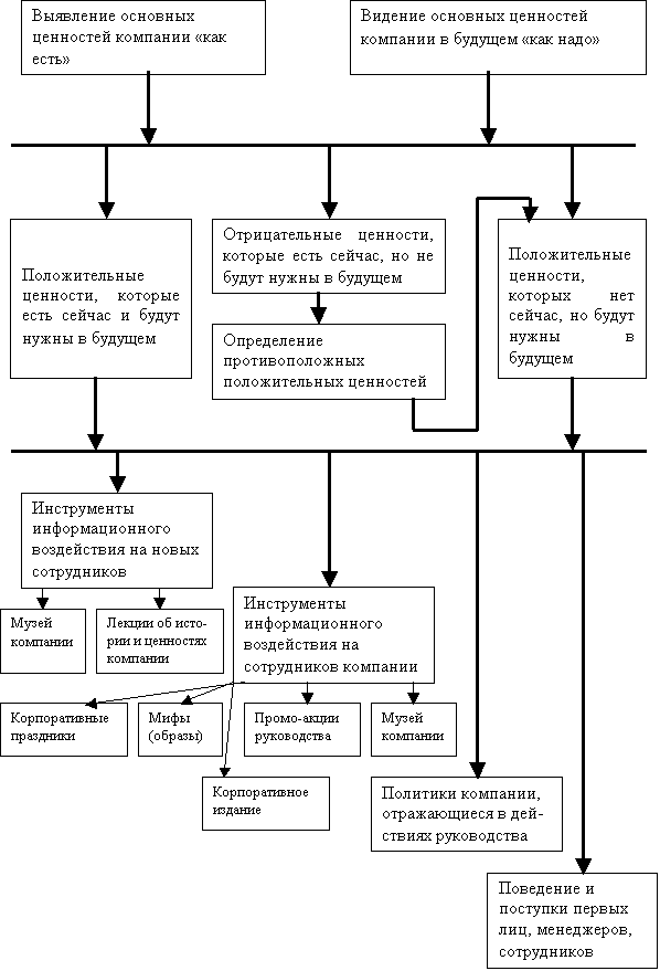 Исходя из текущих ценностей компании и видения будущих ценностей можно получить три основные группы: положительные ценности, которые есть сейчас и будут нужны в будущем; отрицательные ценности, которые есть сейчас, но не будут нужны в будущем; положительные ценности, которых нет сейчас, но они будут нужны в будущем. К отрицательным ценностям, которые появились в компании в последние годы и грозили ей в будущем можно было отнести: безынициативность сотрудников, боязнь менеджеров принимать решение, низкая самоотдача сотрудников. Согласно схеме для выявленных отрицательных ценностей необходимо найти противоположные ценности. Например, инициатива сотрудников, умение менеджеров принимать решения, повышение производительности труда сотрудников. Таким образом, для дальнейшей работы остаются только положительные ценности, которые нужно поддерживать и которые нужно сформировать.