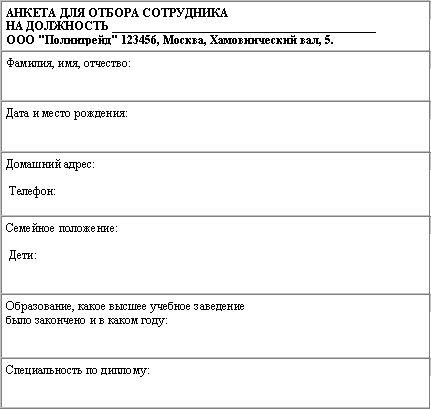 Поскольку анкета для отбора сотрудников отражает особенности определенного вида бизнеса, единого образца такой анкеты практически не существует. В брошюре приводится один из вариантов такой анкеты. Не старайтесь использовать этот образец один к одному. Рассматривайте его в качестве примера. Ваша анкета должна включать такие пункты, которые имеют непосредственное отношение к Вашему виду бизнеса.