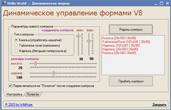 И только теперь мы подходим к самому главному. Форма ведь была нарисована не просто так, а с целью испытать механизм управления элементами формы из кода. И это действительно работает: мало того, что можно задать практически любой параметр любому из существующих контролов, можно прямо из кода создать новый контрол, задать ему свойста (координаты, размеры, визуальный стиль, обработчики событий) и поместить в нужное место формы – и контрол там действительно появится. Ну а если можно добавить, то можно и удалить, верно? ;-)