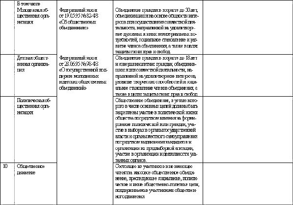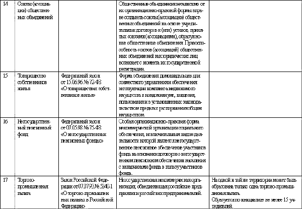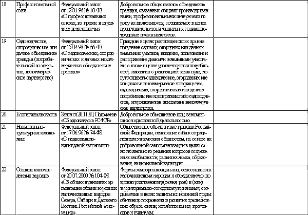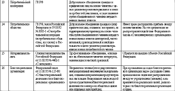 Рассмотрим документы представленных уровней и, прежде всего,Конституции. На практике нередки случаи нарушений и федеральногозаконодательства по отношению к некоммерческим организациям, и нормКонституции. Поэтому важно знать, какие права некоммерческим организациям даетглавный документ — Конституция РФ. Пункт 3 статьи 39 Конституции РФ гласит, чтопоощряются добровольное социальное страхование, создание дополнительных форм социального обеспечения иблаготворительность. В деятельности многих некоммерческих организацийблаготворительность имеет большое значение, а для некоторых — является основнойцелью создания. Но кроме благотворительной деятельности как таковой, в ходереализации целевого проекта или программы в некоммерческих организацияхпользователи получают медикаменты, питание, образование, консультации в областифинансов и права, психологическую или просто душевную поддержку — это тожеформы дополнительного социального обеспечения. Основную массу вопросов,относящихся к сфере гражданского права, регулирует Гражданский кодексРоссийской Федерации. С принятием Гражданского кодекса Российской Федерации1994 года и последующих законов законодательно было введено в оборотнаименование «некоммерческие организации». В отличие от коммерческихорганизаций, закрытый перечень форм которых приведен в статье 50 ГК РФ,организационно-правовые формы некоммерческих организаций, наряду с ГК РФ,описываются в различных федеральных законах, основные из них приведены в табл.1.