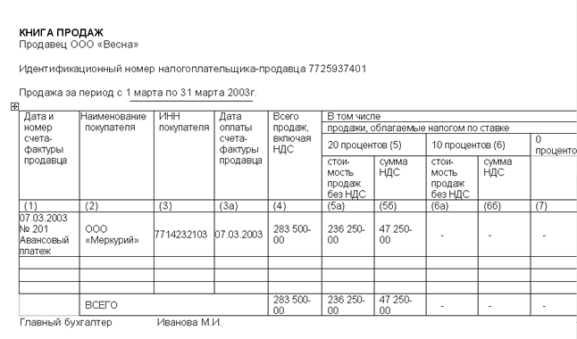 Запись в книге продаж у ООО «Весна» будет выглядеть следующим образом: