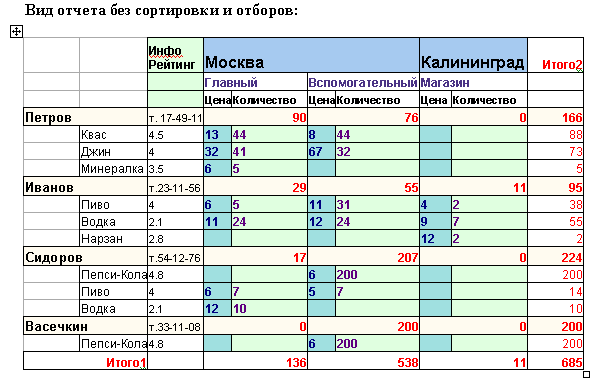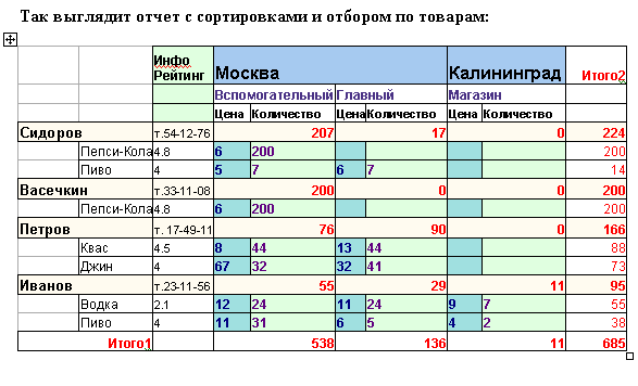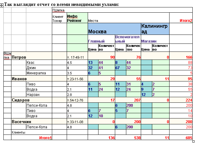 Описание отчета: Сколько товара (черным цветом) купили клиенты и по какой цене (синим цветом) с каждого склада в каждом городе. В поле инфо отображаются телефоны контрагентов и некая оценка популярности товара по пятибальной шкале. Вывести итоги количества продаж товаров по складам, по клиентам, общее проданное количество.