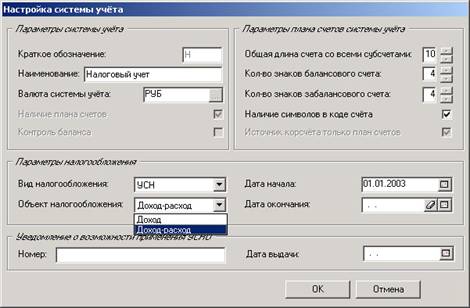 В режиме настройки учета по УСН указываются дата начала и дата окончания применения данного налогового режима. В условиях вновь создаваемого предприятия значение параметра «Дата начала» должно соответствовать дате начала деятельности организации или предпринимателя и совпадать с датой, указанной в «Карточке предприятия» как дата начала работы с системой. Поле «Дата окончания» заполняется в том случае, если налогоплательщик теряет право применения УСН. В него нужно внести дату окончания квартала, предшествующего тому кварталу, начиная с которого налогоплательщик переходит на общий режим налогообложения. Настройка ставок единого налога осуществляется в «Справочнике налогов» подсистемы «Налоги». Налоговая ставка, используемая по умолчанию, помечается флажком.