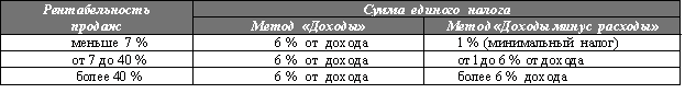 Еще один аспект. Душою понимая, что при определенных условиях «упрощенка» для многих предприятий будет выгодна, тем не менее при выборе метода УСН целесообразно проанализировать рентабельность продаж. При определенной величине рентабельности (в совокупности со всеми показателями) оба метода УСН будут равноценными, но при высокой рентабельности (-более 40%) метод «Доходы минус расходы» может стать не выгодным. В упрощенном варианте анализ на основе рентабельности (без учета остальных показателей) выглядит следующим образом: