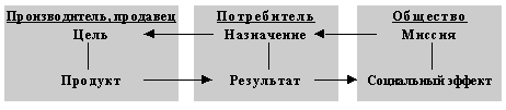 Назначение конкретизируется производителем и продавцом в виде своих целей - проектов продукции и услуг, которые они собираются производить. Отныне каждый несет ответственность перед потребителем за то, правильно ли им понято назначение, насколько его цели соответствуют назначению и достигнуты ли они. Конкретное выражение этой ответственности - необходимость снижать цену или даже потеря покупателя.