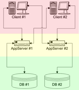 Красная зона – клиенты, жёлтая – сервер приложенийV8, зелёная – сервер баз данных MSSQL. СерверAppServer#1 обслуживает базу DB#1, и подключить к этой же базесервер AppServer#2 нельзя.