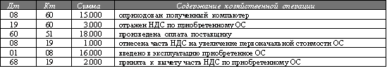 Пример 1. Предприятие, осуществляющее два вида деятельности (В "обл = 1.200 тыс. руб., В необл – 500 тыс. руб.), приобрело для центральной бухгалтерии компьютер на сумму 18.000 руб. (в т.ч. НДС 3.000 руб.). НДС уплачивается ежемесячно.