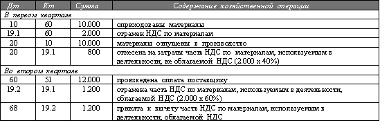 Пример 2. Предприятие в 1 кв. приобрело партию материалов стоимостью 12.000 руб. (в т.ч. НДС 2.000 руб.), которая была оплачена во 2 кв. Облагаемая НДС выручка составила 60 % от общего объема реализации в 1 кв.