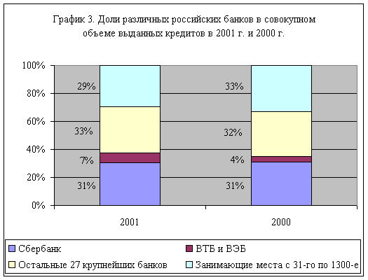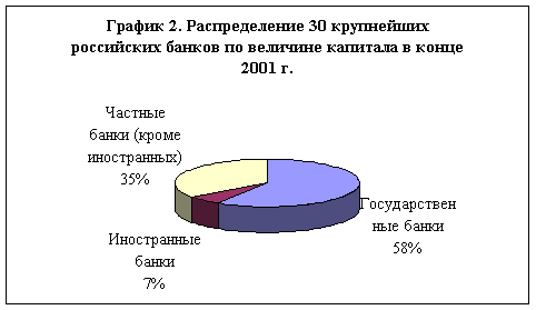 Все эти тенденции,вероятно, могут привести к некоторому повышению рыночных позиций ведущих банков,следующих по значению за Сбербанком. График 3 показывает, что доля 29 крупнейшихбанков (не считая Сбербанка) в общем обЪеме выданных кредитов возросла с 36% в 2000 году до40% в 2001 году за счет сокращения доли остальных, более мелких банков. Вто же время доля Сбербанка осталась на прежнем уровне. Существует вероятность,что в ближайшие годы некоторые крупные частные банки будут вытеснены со своихпозиций другими банками. Российский банковский сектор остается незрелым, слаборазвитым и характеризуется недостаточным уровнем капитализации. Вложение порядка1 млрд долларов (не такая уж большая цифра в сравнениис суммами, выплачиваемыми зарубежными финансовыми учреждениями банкам в ЛатинскойАмерике, Центральной и Восточной Европе и даже в Турции) могло бы очень быстроизменить структуру российского банковского сектора. В настоящее время в сферебанковского посредничества находится лишь небольшая часть российской экономики,причем некоторые задачи отчасти выполняют крупные промышленные компании, как,например, Газпром, привлекающий займы непосредственно на рынке евро.