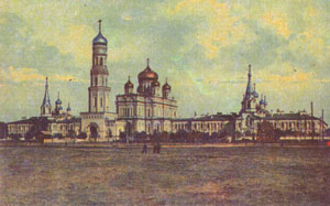 Жемчужиной монастыря являлась высокая колокольня, возвышавшаяся перед зданиями обители со стороны проспекта. Построенная в 1892-1895 годах по проекту архитектора Л.Н. Бенуа, своим внешним видом она напоминала колокольню Ивана Великого в московском Кремле.