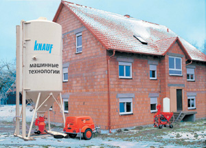 Процесс полной механизации строительных работ организуется следующим образом. Силос емкостью 12,5 м или 22,5 м, загруженный на заводе «КНАУФ ГИПС КОЛПИНО» сухой гипсовой штукатурной смесью МП-75 доставляется прямо на строительный объект. Сухая смесь с помощью пневмотранспортной установки доставляется к штукатурной машине практически на любой этаж, причем необходимый уровень сухой смеси в бункере штукатурной машины поддерживается автоматически. А штукатурная машина в непрерывном режиме смешивает сухую смесь с водой и подает готовый раствор на стену.
