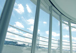 Остекление (в общей сложности 30 квадратных метров) разбито установленными через каждые 90 градусов дверьми на четыре сектора, отличающихся оттенками цвета зеркальных (двойных, толщиной 3 мм каждое) стекол: серебряным, бронзовым, зелёным и синим.