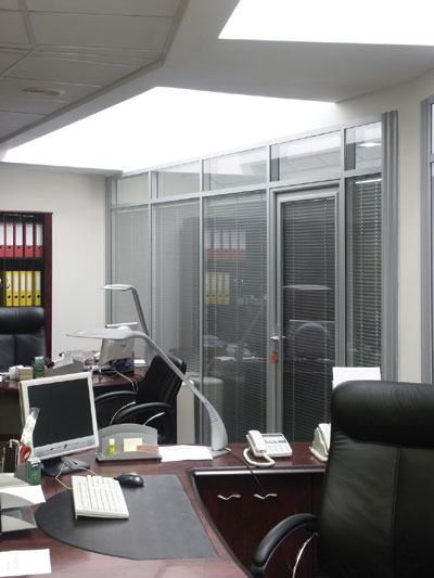 Хорошим решением проблемы офисного «небосвода» являются натяжные потолки (например, Extenzo). Это довольно простая конструкция, состоящая из специального каркаса («багета») и тонкой виниловой пленки. Впрочем, кажущаяся простота скрывает суперсовременные технологии и материалы – ведь этот прочный материал не только выдерживает до 10 л воды на квадратный метр поверхности (проблема протечек решена!), но и очень эстетично выглядит.