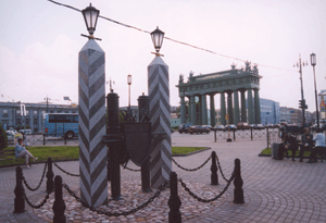 …При последней реставрации была восстановлена «посвятительная надпись» на воротах, текст которой, по преданию, сочинил лично Николай I: «Победоносным российским войскам, в память подвигов в Персии, Турции и при усмирении Польши в 1826, 1827, 1828, 1829, 1830, 1831 годах». Явный политический подтекст той части надписи, которая относилась к Польше, еще в XIX веке вызывал неприятие тех, кто сочувствовал борьбе поляков за свою независимость. Не случайно в 1918 году исполком Петроградского совета распорядился ликвидировать царскую надпись на воротах как «позорную».