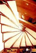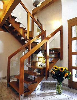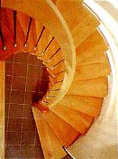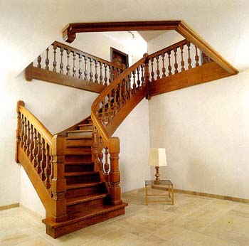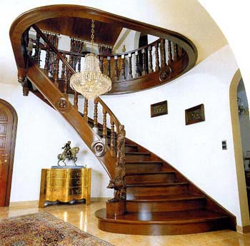 Поворотные лестницы бывают разных видов. В частности, криволинейные изготавливают с обязательной шириной узкого конца не менее 10 см. Лестницы изогнутой формы экономичны и в то же время монументальны. На лестнице с забежными ступенями нога не чувствует достаточной опоры, поэтому их используют реже. Кроме того, поворотные лестницы разделяют на четвертьоборотные, полуоборотные и круговые. Угол поворота четвертьоборотной лестницы составляет 90o (их обычно устанавливают вдоль двух смежных стен), полуоборотных - 180o, а круговых - 360o.