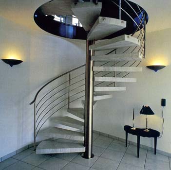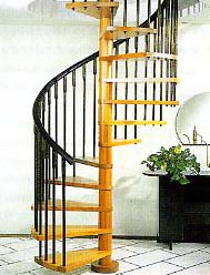 Винтовые, или спиральные лестницы применяются в тех случаях, когда в помещении недостаточно места для прямых лестниц. Винтовые лестницы менее удобны для передвижения, чем прямые, но позволяют экономить площадь помещения. Часто применяются как вспомогательные для подъема или спуска в цокольный этаж. Принципиальной особенностью винтовых является крепление ступеней вокруг столба, или стойки. Ступени винтовой лестницы клиновидной формы и располагаются вокруг этой центральной стойки. Чаще всего она выполняется в виде металлической трубы. Узкая сторона ступеней крепится к стойке, а широкая чаще всего - к балясинам или к стенам. Подступенок, как правило, отсутствует - широким торцом ступень крепится к стойке перил. Чтобы нога комфортно "чувствовала себя" на ступени, центральная ширина проступи должна составлять не менее 200-250 мм, в самой широкой части - не более 400 мм.