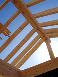 Балки перекрытий представляют собой брусья, склеенные из горизонтально уложенных ламелей. Сечение балок перекрытия зависит от пролетов и нагрузок. Балки фиксируются на стенах и сращиваются встык стальными уголками и накладками, которые крепят саморезами.