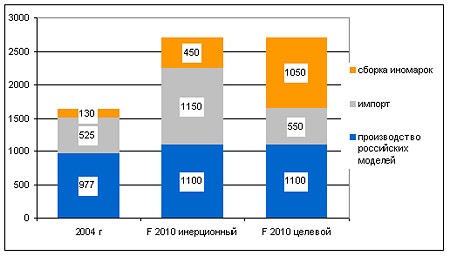 В контексте происходящих на данный момент событий на российском авторынке можно утверждать, что развитие российской автомобильной промышленности будет складываться по второму варианту прогноза МЭТР. В данном случае рост производства отечественных автомобилей за прогнозируемый период составит около 13%, при этом среднегодовой темп прироста будет находиться на уровне 2% годовых. Объем же иномарок собранных на территории РФ вырастет более, чем в 8 раз, при этом среднегодовой темп роста составит 51%.