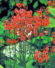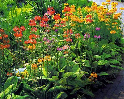 С мая по июль пруд украшают гибридные сорта примулы японской (P. japonica) и примулы буллезианской (P. bullesiana). Эти высокие (40-80 см) растения привлекают к себе внимание желтыми, оранжевыми, розовыми, красными или фиолетовыми цветками, расположенными ярусами один над другим. Высаженные в сад, они предпочитают скорее тенистое место и влажную, богатую гумусом почву. Красивый ансамбль возле пруда или по краю древесных насаждений вместе с примулами составят, к примеру, гейхера, ирис, папоротники, рододендрон, болотные злаки и осоки.