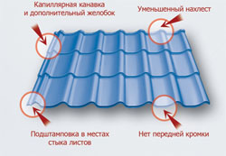 Более надежной кровлю из металлочерепицы LORICA делает наличие капиллярной канавки и дополнительного желобка в левой части листа, что предотвращает попадание влаги под кровлю вследствие капиллярных эффектов и придает дополнительную жесткость кромке.