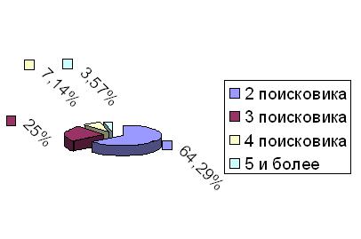 Что касается наиболее популярных поисковых систем, то тут результаты предсказуемы. Все опрошенные в списке предпочитаемых поисковиков отметили Яндекс и Google (по 100 %). Рамблером и Yahoo! пользуется 17,9% респондентов. Распределение всех остальных поисковиков представлено в таблице: