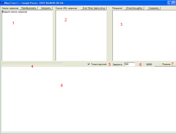 1.Поле ввода запросов. Сюда нужно ввести список запросов к Google, например, inurl:«xxx» (обратите внимание на то, что оператор и запрос пишутся без пробела). 2.Поле ввода-вывода URL запросов к Google. В этом поле будет появляться, какие URL Google парсятся при выполнении запросов. При желании можно самому сюда ввести список urls Google, которые нужно отпарсить. К примеру: «http://www.google.com.ua/search?hl=ru&q=XXX&btnG=%D0%9F%D0%BE%D0%B8%D1%81%D0%BA+%D0%B2+Google&meta=» 3.Поле вывода результа – URL сайтов, которые нашлись. 4.Процент выполненения задачи 5.Фильтр на парсинг только русскоязычных сайтов 6.Задержка в тысячных долях секунды. От 0 до 60 000. Задержка нужна, чтобы гугл не понял, что его парсит программа и не заблокировал вам доступ к ресурсам. 7.Кнопка «Поехали» запускает парсинг. 8.Показывает страницу, которая парситься в данный момент. Пользы особой нет, скорее для развлечения. Дополнительно над полем ввода запросов (1) есть кнопка «преобразовать», которая преобразует запросы inurl:«XXX» в -intext:"XXX" -intitle:"XXX" "XXX" Как пользоваться программой? Ввести в левое поле ввода(1) список запросов, подождать и копировать из правого поля ввода(3) результат. Потом отчистить дубли доменов, например, с помощью http://bajron.od.ua/?p=67. Реузльтаты хранятся в формате списка URL найденных сайтов. Программа избавляет от большей части рутинной работы и парсит намного быстрее человека.