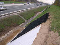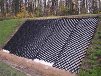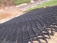 Георешетка выполняет функцию сохранности откосов и склонов, Использование георешетки даже на очень крутых склонах, а также, наполнение ее проницаемыми материалами, приводит к тому, что увеличивается устойчивость склонов к поверхностной эрозии, а соответствующий уровень влажности внутри ячеек решетки обеспечивает рост разного рода растительности (результата -эстетичный вид выполненных земляных работ].