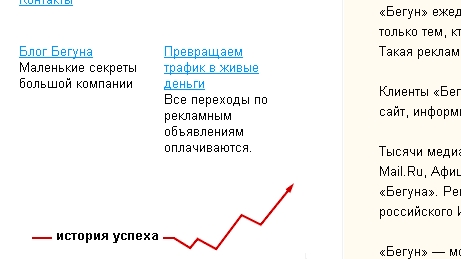 Компания "Бегун", которая занимается контекстной рекламой, сделала другой выбор. Был проведен анализ целевой аудитории, в результате чего вычленена одна составляющая, характерная для всех клиентов "Бегуна". Стремление к успеху. В результате контент на сайте ориентирован на клиента, который стремится к успеху. Предложения краткие и понятные, выдержанные в "деловом стиле". В качестве фонового ресурса используется график роста.