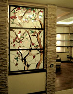 Для самой динамичной части интерьера - двери - лучше выбрать витраж, сделанный по новейшей технологии с красивым названием фьюзинг. На русском это звучит не столь привлекательно, но довольно любопытно - спекание стекла. Кусочки цветного стекла накладываются на бесцветный лист и действительно запекаются в специальной печи при температуре 850 °С, образуя рисунок. По сути, это уже не витраж, а вариация на тему. Здесь не используют ни фольгу, ни металлический профиль. Получается прочная и оригинальная постмодернистская композиция, естественно, со своим "но". Размеры спечного витража напрямую зависят от размера печи. Маленьких витражей можно сделать сколько угодно, а вот чего-то грандиозного уже не получится. Но для этого у нас есть классическая техника, а такие витражи нашли свое место в корпусной и встроенной мебели, светильниках, при декорировании зеркал и кафельной плитки. Квадратный метр такого витража стоит не дороже классического.