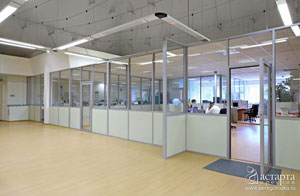 Обратимся к первому типу. Стационарные перегородки крепятся к стенам, полам и потолку и собираются на месте. Их задача - разделение всех помещений на функциональные зоны и создание отдельных пространств (приемных, кабинетов и т.д.).