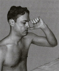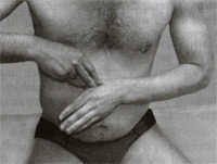 1-й этап. Скрещивая руки, средними и безымянными пальцами обеих кистей круговыми движениями против часовой стрелки массировать точки акупунктуры, расположенные на окончании складок локтей с наружной и внутренней сторон, одновременно приподнимая и опуская руки. Массаж повторить 15 раз. Массаж осуществляют с изрядной силой в течение 1 минуты с перерывом 1 минута. 2-и этап.
