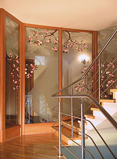 В качестве заполнения секций, может быть стекло либо шпонированные панели. Работая с фактурой дерева, дизайнер получает огромные возможности для воплощения в жизнь своих творческий фантазий. Выбирая дерево для отделки, можно поиграть с направлением волокон шпона, сочетанием различных срезов дерева. Компания может предложить на выбор более 80 вариантов шпона, что дает возможность гармонично сочетаться с мебелью или другими деталями интерьера. Оригинально смотрится на шпонированной секции инкрустация из различных видов шпона, когда сочетания цвета и фактуры гармонично дополняют друг друга. Стекло, используемое в секциях, поддается различным видам обработки. Все это дает возможность перегородке стать значимой и яркой частью интерьера. Двойное остекление и использование звукоизоляционных материалов позволяют обеспечить высокие акустические характеристики - до 40 Дб - в VIP-зонах, в кабинетах руководителей, переговорных.