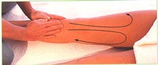 7. Основаниями обеих ладоней попеременно начинайте разминать мышцы выше колена. Движения как бы подталкивают мягкие ткани кверху. Постепенно продвигайтесь вверх, в сторону бедра.