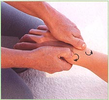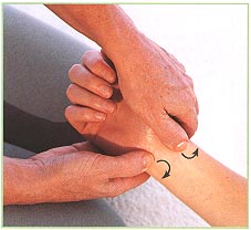 2. Переведите руки к запястью массируемого: большие пальцы сверху остальные подведены под ладонь. Большими пальцами промассируйтс сверху область запястья. Движения легкие, круговые.