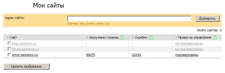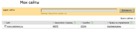 Что обещает. Золотых гор и полной базы бэклинков не обещали. А именно: •дата последнего обращения поискового робота к сайту; •количество проиндексированных страниц и структура разделов сайта; •количество ошибок и распределение их по разделам; •список страниц, которые не удалось проиндексировать, с указанием причины ошибки. Наши шаги. И первым шагом стала авторизация на Яндекс.Вебмастер: вводим URL сайта и нажимаем "Добавить". Однако получить доступ к сервису можно только после подтверждения прав на управление сайтом. Убедить систему в своей причастности к данному сайту можно на выбор двумя способами: создать текстовый файл в корневом каталоге или прописать мета-тег на главной странице. Мы интуитивно прибегли ко второму варианту (просто мета-тег оказался роднее, понятнее, какого-то там корневого файла). Другие продвинутые веб-мастера, как стало известно позже, сознательно склоняются к первому - чтобы не засорять главную страницу непонятными тегами. Итак, права на управление сайтом подтверждены. Я.Вебмастер приветствует нас в лице страницы «Мои Сайты». Небольшая (в нашем случае) таблица, представленная одним сайтом (www.seonews.ru) и следующей информацией о нем: загружено страниц, ошибки и права на управление.