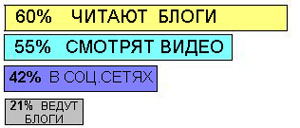 Просто веселая история Сначала Руслан Чачанов, руководитель отдела рекламы, маркетинга и PR Liveinternet , запоролся сам. Когда начал свой рассказ с истории про золотистую иномарку, которая сбила женщину с коляской на одной из оживленных улиц москвы. Запоролся на том, что перепутал марку автомобиля (Матис-Ниссан). Потом Руслан наравался на грубость, когда обвинил все СМИ в неоперативности, замалчивании и искажении информации. Если бы в зале сидели газетчики, думаю, они бы смолчали. Но Галина Тимченко, главред Ленты.ру, объяснила Руслану, как работают редакции больших интернет-изданий, кто главнее - репортер, опросивший трех очевидцев, или блогер, случайно проходивший мимо. Кому больше верят? Галина, в отличие от Руслана, точно знала и марку машины, и диагноз младенца, сбитого Ниссаном. Но соль истории не конфузе г-на Чачанова. А в том, что он пришел объявить о запуске совместного с «одним крупным интернет-изданием» контент-проекта. Что за издание, Руслан не сказал, но понятно, что это не «Лента ру». Вот такая история в стиле «я сказал, не то, что вы подумали». Реклама рекламы 2.0. или в чем сила, брат? А «Сила в людях». Исследование под таким названием презентовала Евгения Семина из UniversalMcCan (что это за рекламная контора, не знаю). Но исследование, говорят, глобальное, охватывало весь мир, длилось год в три этапа и изучало вовлеченность аудитории в веб 2.0. По сути, «красивая картинка» для рекламодателей из серии «интернет-реклама растет семимильными шагами». Но других (аналогичных тем, что привела Евгения) данных по России мне не встречалось. Поэтому просто цифры, графики без комментариев. Россия по сравнению с остальной Европой 1 место по вовлеченности в социальные сети 2 место по скачиванию видео 4 место по охвату блогами Чем занимаются рунетчики в блогосфере (в % от интернет-пользователей)