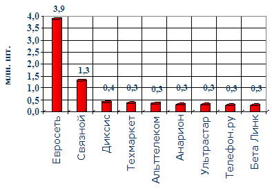Для сравнения, ближайший конкурент на российском рынке, сеть салонов «Связной» в 1 полугодии продала 1,3 млн. телефонов против 3,9 млн. у «Евросети». А крупнейший западноевропейский ритейлер на телекоммуникационном рынке CARPHONE WAREHOUSE имеет на сегодня чуть более 1800 салонов.