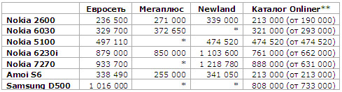 * Цена на момент подготовки отсутствовала (телефона нет в прайсе или аппарат не продается)