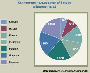 Европейские операторы мобильной связи с интересом наблюдали за развитием услуги в Японии. Сегодня в Японии насчитывается 42 млн. пользователей i-mode, что составляет 60% от общего количества пользователей мобильной связью в стране. Кроме продуманной бизнес-модели и ценовой политики, такому успеху способствует местная специфика и менталь-ность: высокая стоимость фиксированного коммутируемого доступа к интернету, особая любовь местных жителей к различным электронным приборам, и, что касается информационного наполнения, пристрастие к гороскопам и мультфильмам.